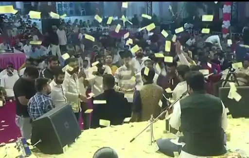 રાજકોટ-ગોંડલ નેશનલ હાઇવે પર રીબડા ગામમાં ભાઈશ્રી રમેશભાઈ ઓઝાની ભાગવત સપ્તાહનું આયોજન કરવામાં આવ્યું છે, જેમાં રાત્રિના સમયે લોકડાયરાનું આયોજન કરવામાં આવ્યું હતું. લોકડાયરામાં કલાકારોએ ગીતો અને ભજનોની રમઝટ બોલવતાં લોકો મન મૂકીને વરસ્યા હતા. લોકડાયરામાં કોથળા મોઢે રૂપિયા ઊડતા ચારેતરફ રૂપિયા જ રૂપિયા જોવા મળ્યા હતા તેમજ ભાજપના નેતાઓ પર પણ 100 અને 500ની નોટો વરસાદ થયો હતો. સ્ટેજ અને આસપાસની જગ્યામાં નજર પડે ત્યાં રૂપિયા જ રૂપિયા જોવા મળ્યા હતા.