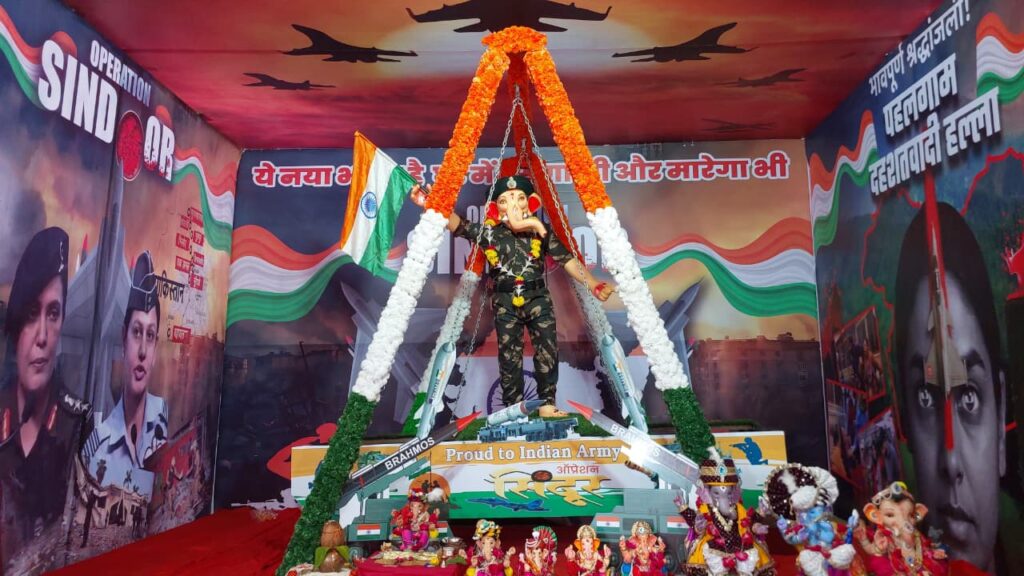 નર્મદા જિલ્લાના રાજપીપલા ખાતે ઋણ મુક્તેશ્વર મહાદેવ યુવક મંડળ દ્વારા ઓપરેશન સિંદૂર ની થીમ પર ગણેશજી ની પ્રતિમા ની સ્થાપના કરવામાં આવી છે.
