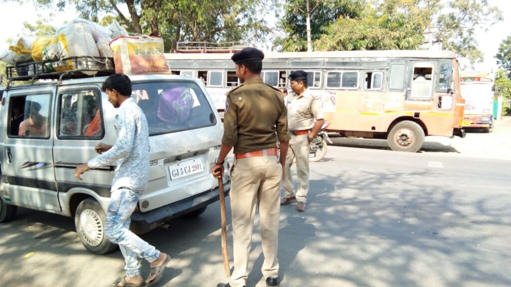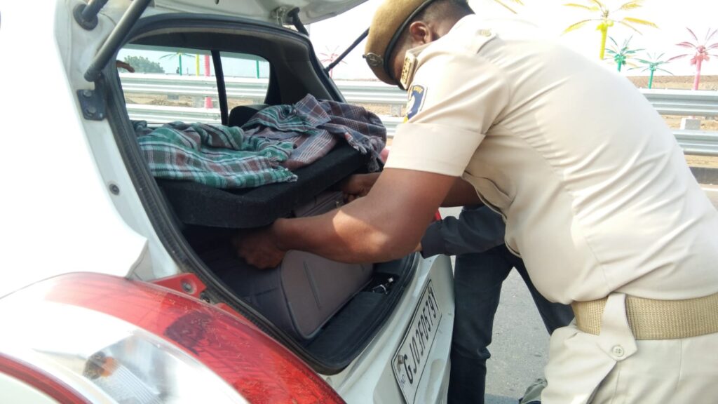 ગુજરાત રાજ્યની બોર્ડર ગણાતી ધનસેરા ચેકપોસ્ટ પર પોલીસ બ્રેથ એનેલાઈઝરથી નસેબાજોને ચેક કરી રહી છે;